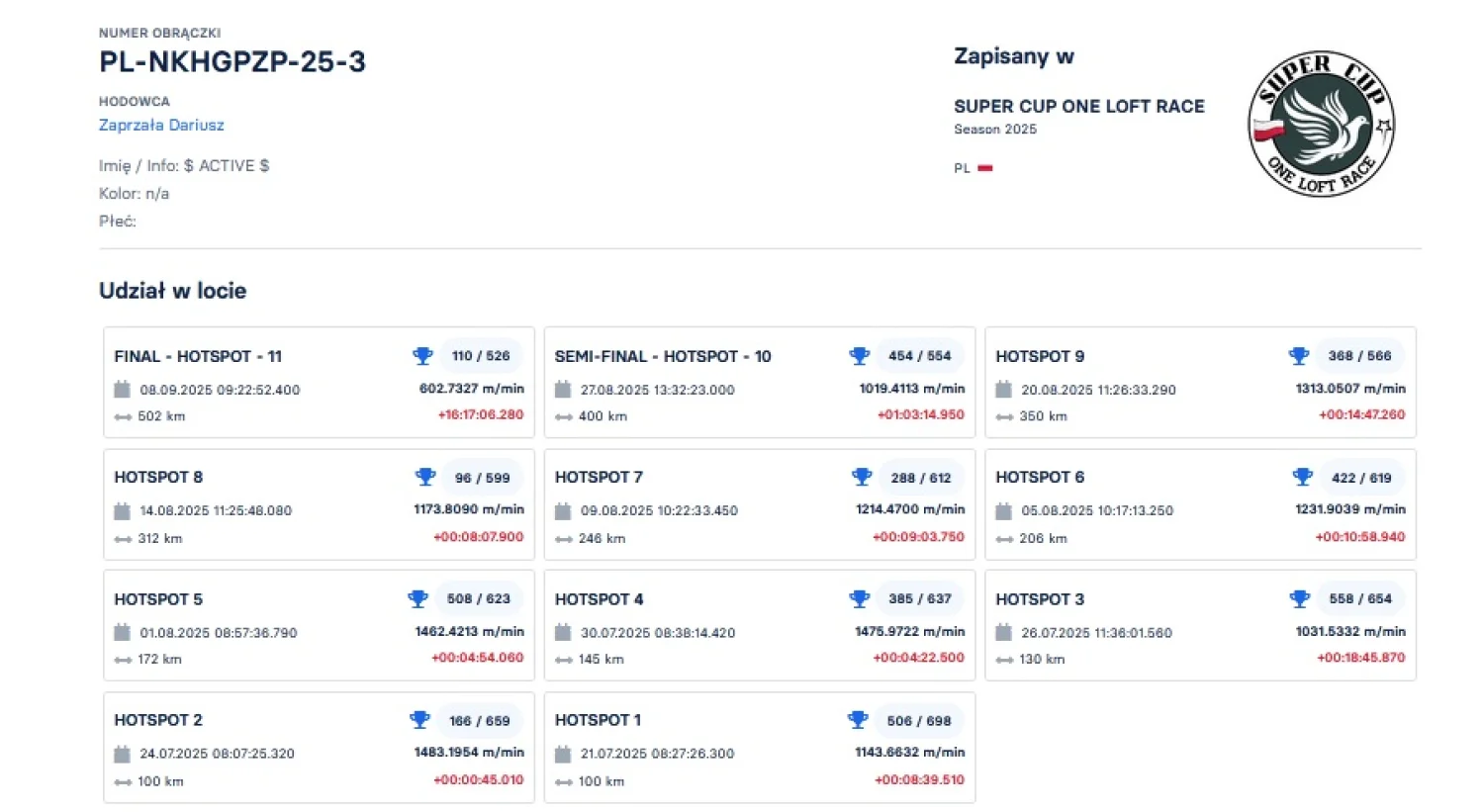 Gołębie z WG OLR SUPER CUP 2025 – uczestnicy 11 lotów na dystansie aż 2664 km,