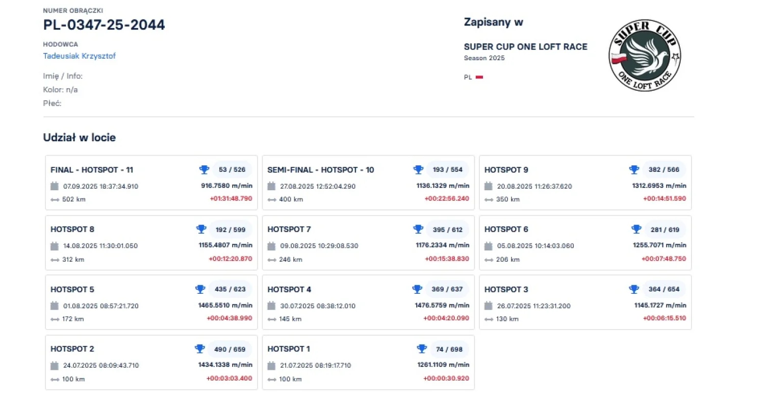 Gołębie z WG OLR SUPER CUP 2025 – uczestnicy 11 lotów na dystansie aż 2664 km,