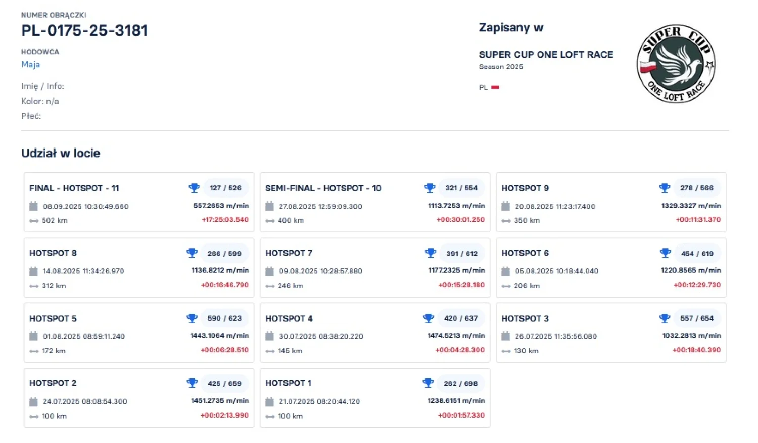 Gołębie z WG OLR SUPER CUP 2025 – uczestnicy 11 lotów na dystansie aż 2664 km,