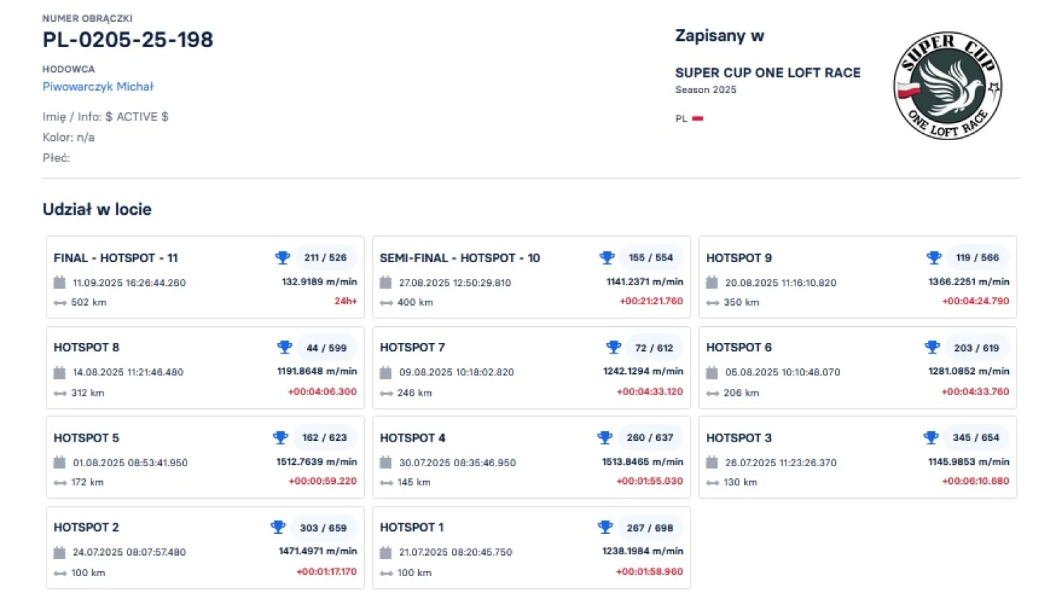 Gołębie z WG OLR SUPER CUP 2025 – uczestnicy 11 lotów na dystansie aż 2664 km,