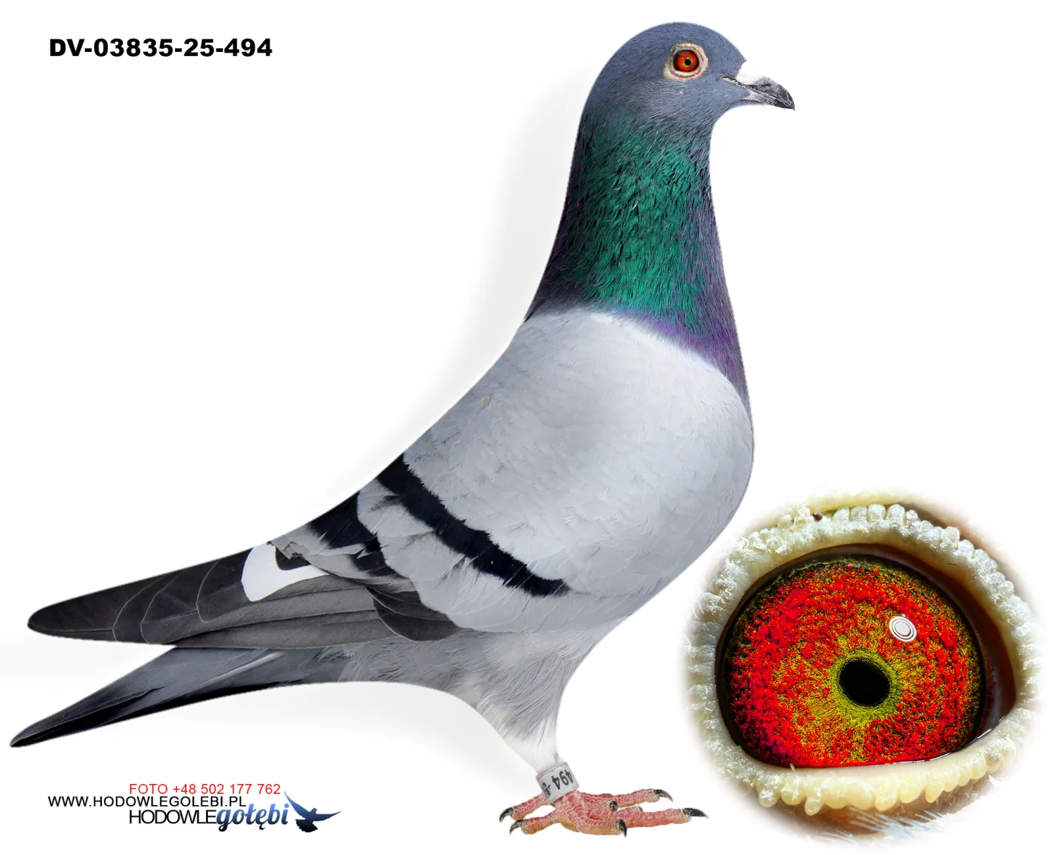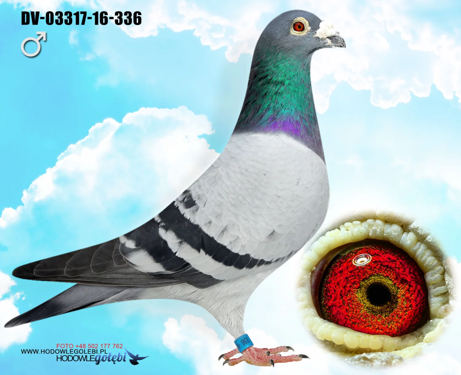 Więcej informacji w rodowodzie lub pod nr tel. +48 502 177 762. Oferowany gołąb to prawdopodobnie samiec (V)