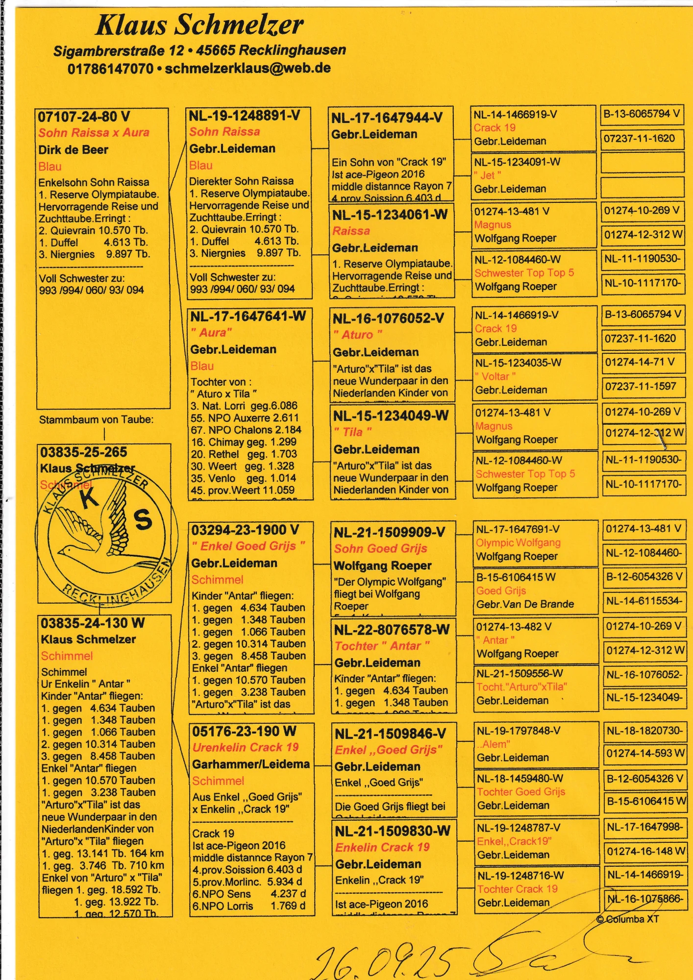 Oryginalny gołąb z hodowli Klausa Schmelzera. . Gołębie znajdują się w Polsce i będzie można je odebrać na wystawie Ogólnopolskiej lub wysyłka kurierem. Szczegóły pochodzenia w rodowodzie. Więcej informacji pod nr tel. 502 177 762