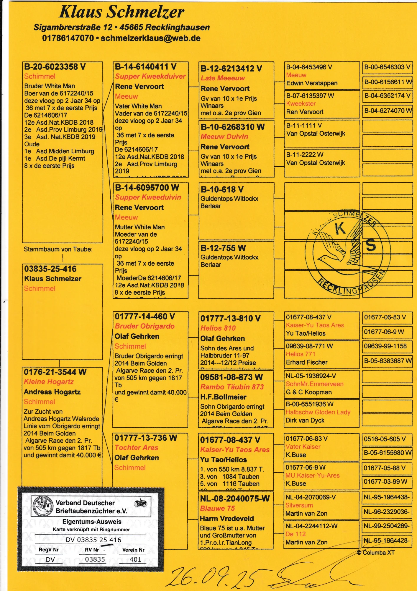 Oryginalny gołąb z hodowli Klausa Schmelzera. . Gołębie znajdują się w Polsce i będzie można je odebrać na wystawie Ogólnopolskiej lub wysyłka kurierem. Szczegóły pochodzenia w rodowodzie. Więcej informacji pod nr tel. 502 177 762