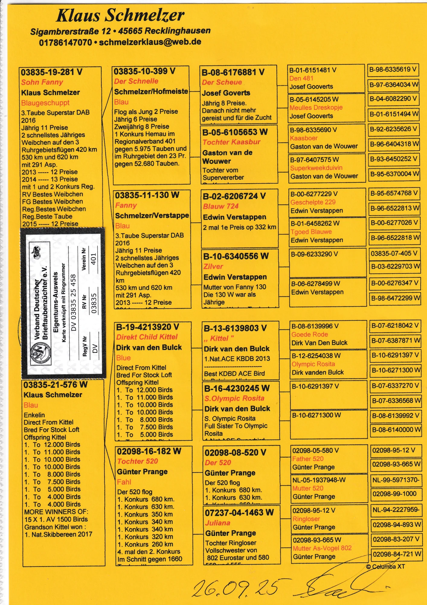 Oryginalny gołąb z hodowli Klausa Schmelzera. . Gołębie znajdują się w Polsce i będzie można je odebrać na wystawie Ogólnopolskiej lub wysyłka kurierem. Szczegóły pochodzenia w rodowodzie. Więcej informacji pod nr tel. 502 177 762
