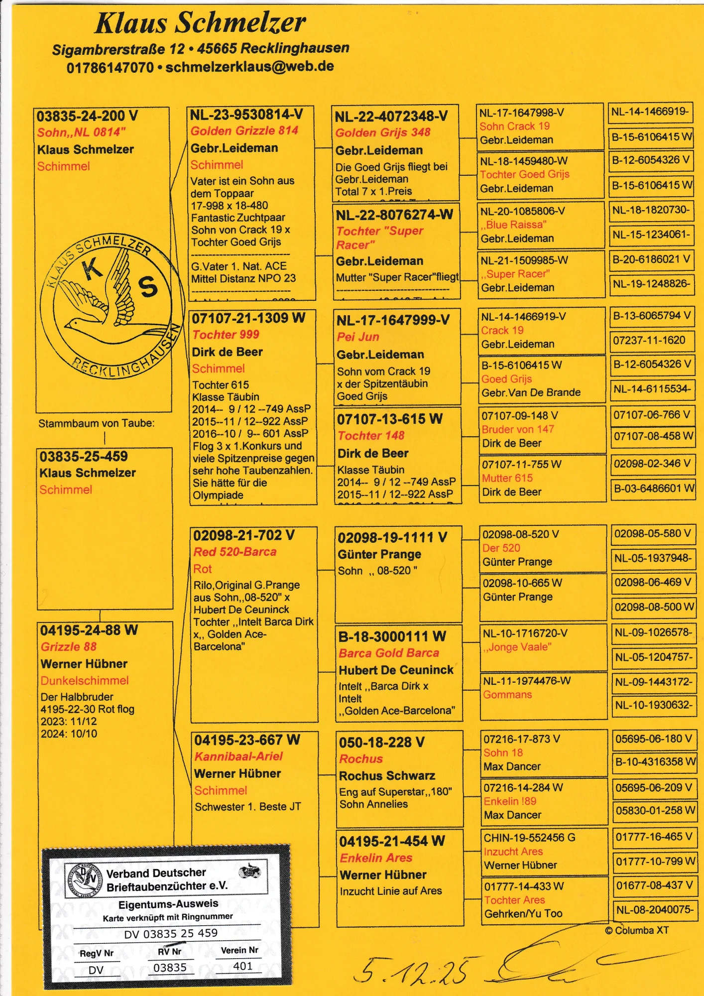 Oryginalny gołąb z hodowli Klausa Schmelzera. . Gołębie znajdują się w Polsce i będzie można je odebrać na wystawie Ogólnopolskiej lub wysyłka kurierem. Szczegóły pochodzenia w rodowodzie. Więcej informacji pod nr tel. 502 177 762