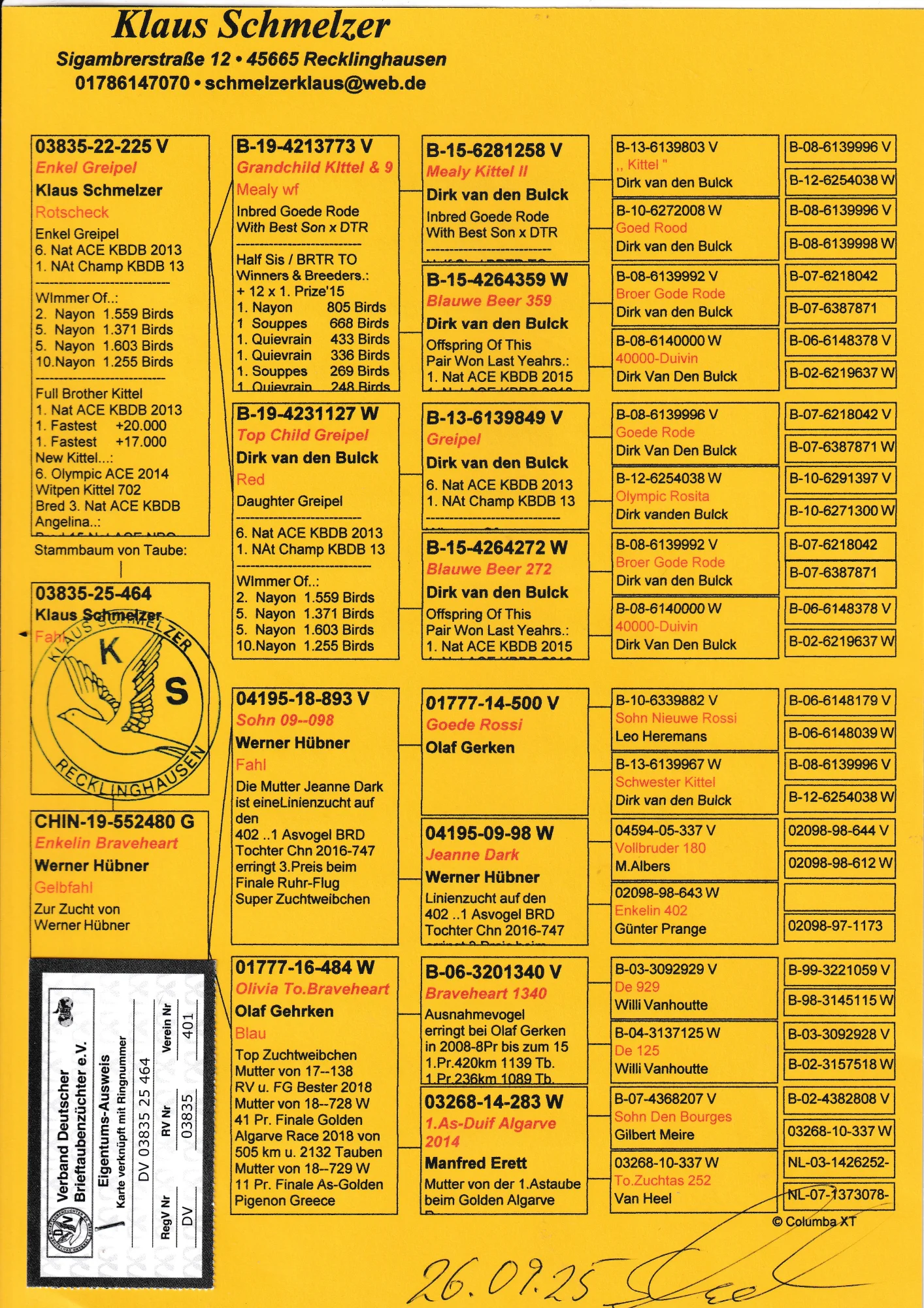 Oryginalny gołąb z hodowli Klausa Schmelzera. . Gołębie znajdują się w Polsce i będzie można je odebrać na wystawie Ogólnopolskiej lub wysyłka kurierem. Szczegóły pochodzenia w rodowodzie. Więcej informacji pod nr tel. 502 177 762