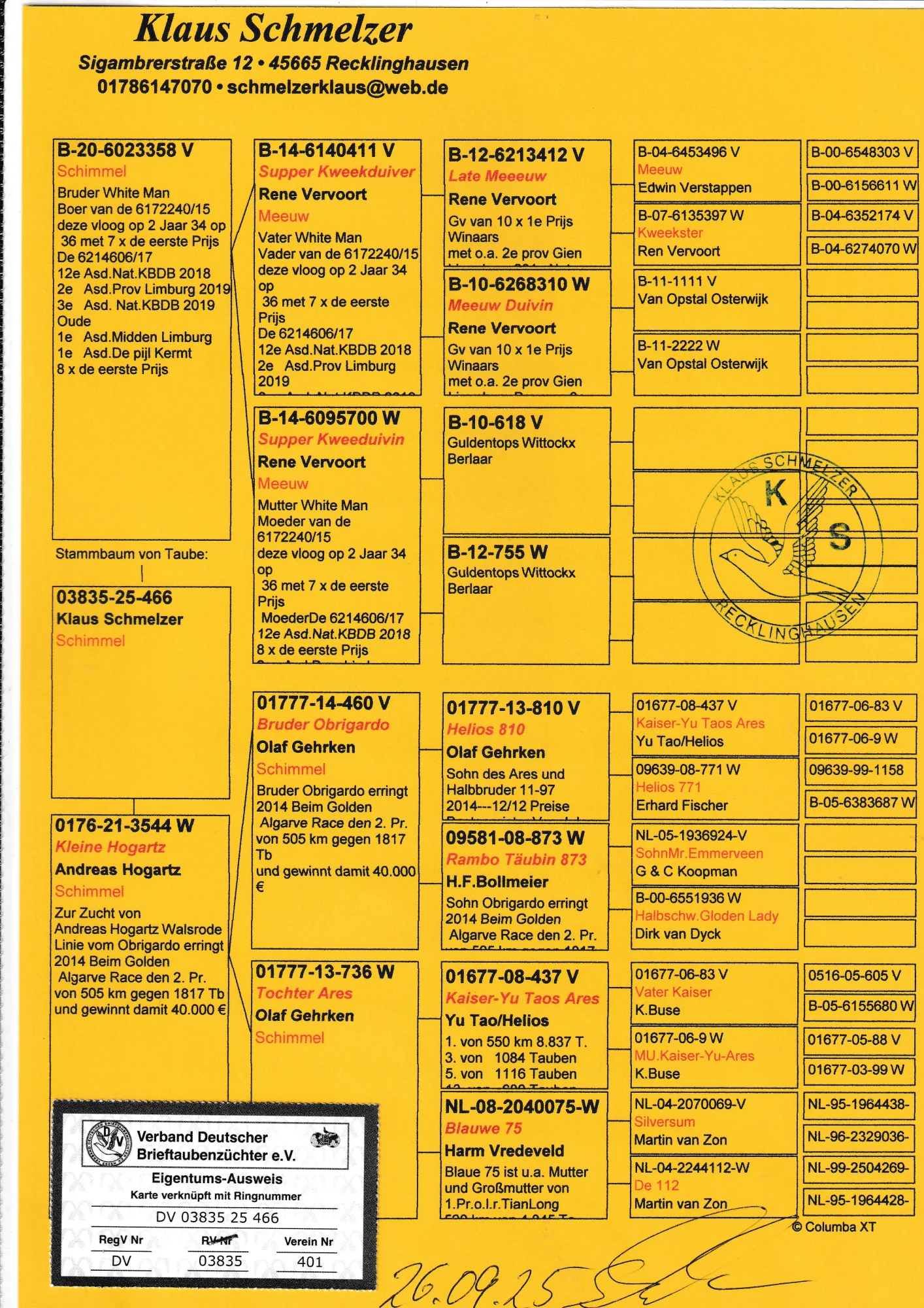 Oryginalny gołąb z hodowli Klausa Schmelzera. . Gołębie znajdują się w Polsce i będzie można je odebrać na wystawie Ogólnopolskiej lub wysyłka kurierem. Szczegóły pochodzenia w rodowodzie. Więcej informacji pod nr tel. 502 177 762