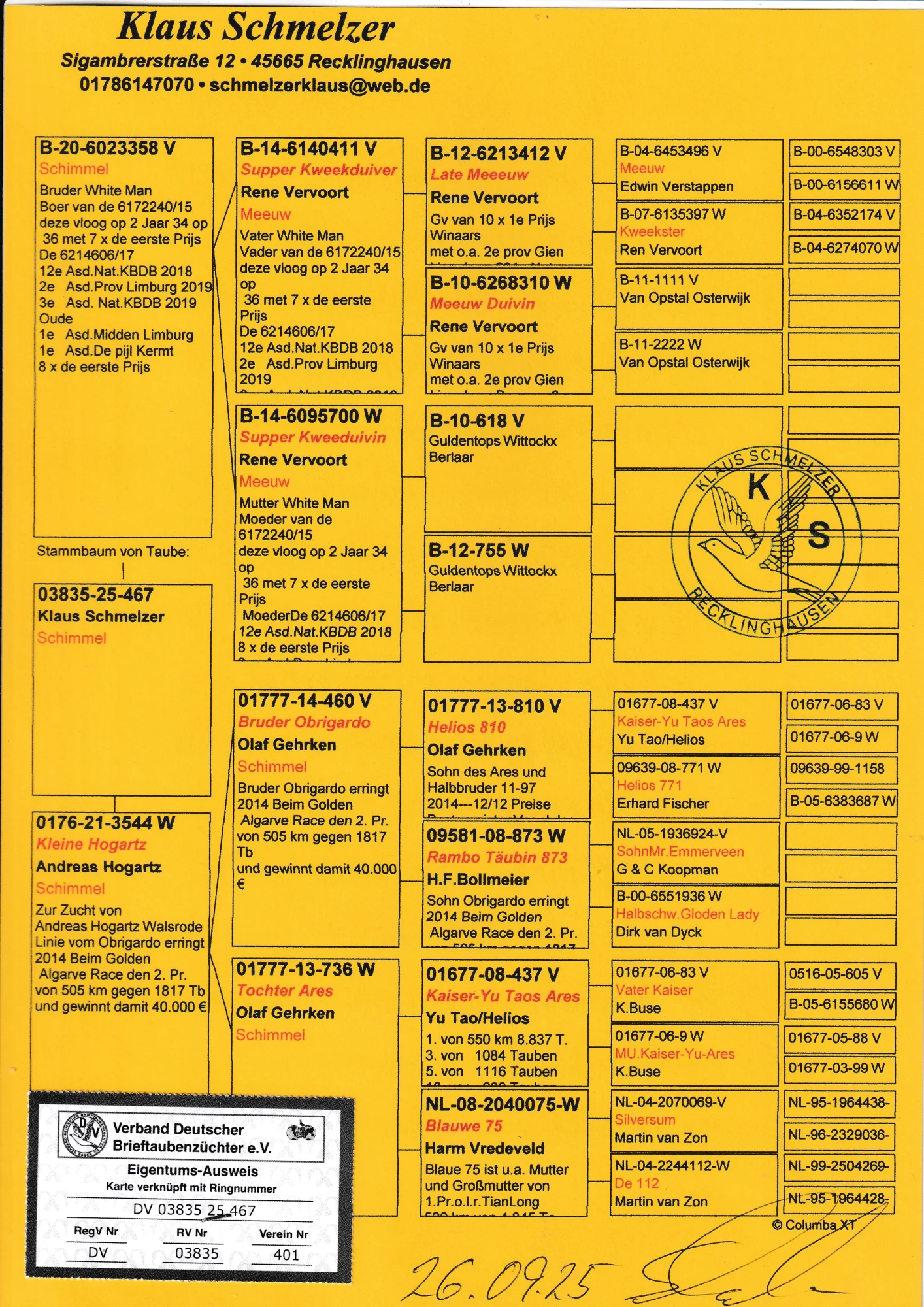 Oryginalny gołąb z hodowli Klausa Schmelzera. . Gołębie znajdują się w Polsce i będzie można je odebrać na wystawie Ogólnopolskiej lub wysyłka kurierem. Szczegóły pochodzenia w rodowodzie. Więcej informacji pod nr tel. 502 177 762