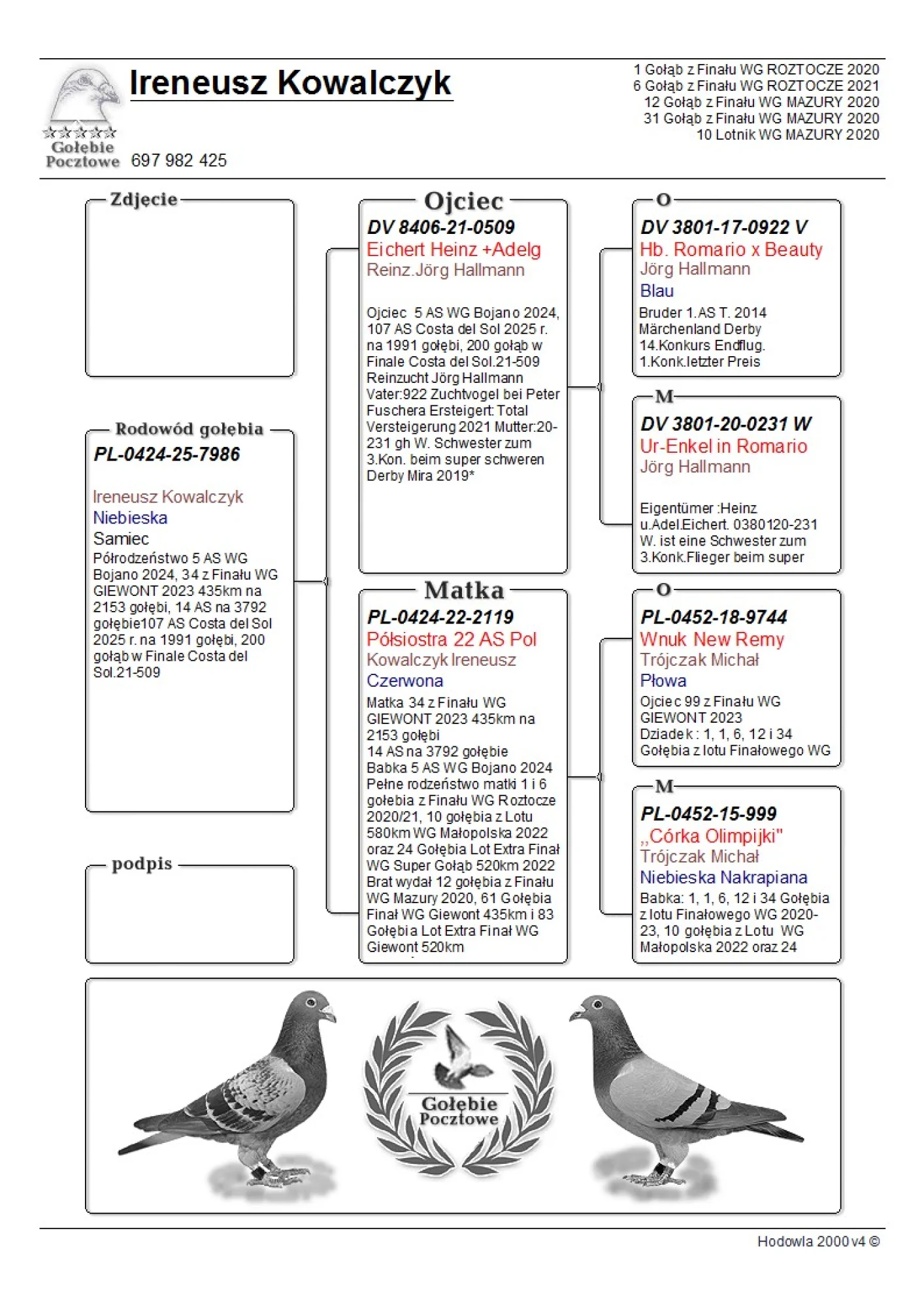 Oryg.gołąb z hodowli Ireneusz Kowalczyk więcej informacji w rodowodzie lub pod nr tel 697 982 425