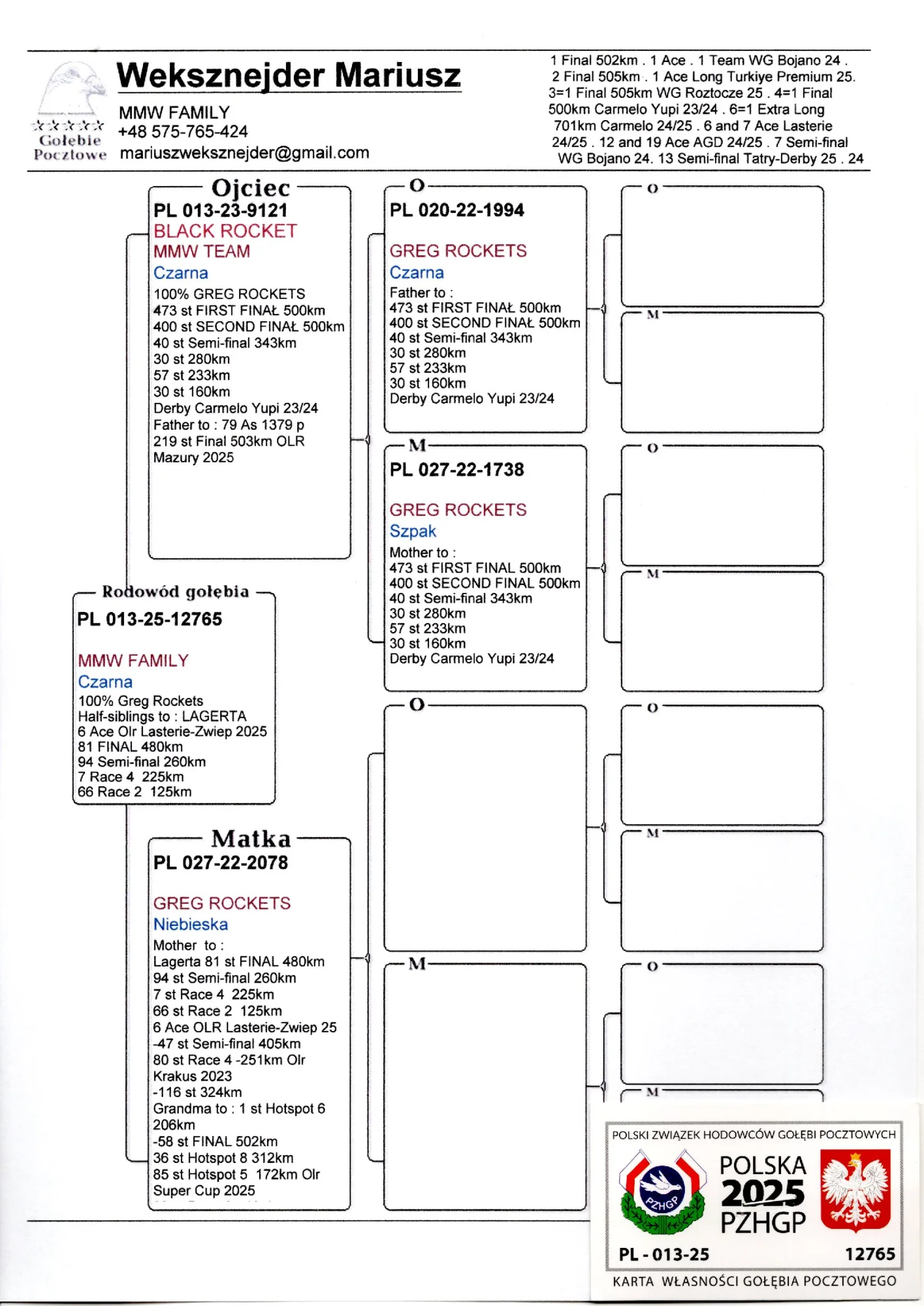 Oryg.gołąb z hodowli Mariusz Weksznejder więcej informacji w rodowodzie lub pod nr tel. +48 575-765-424