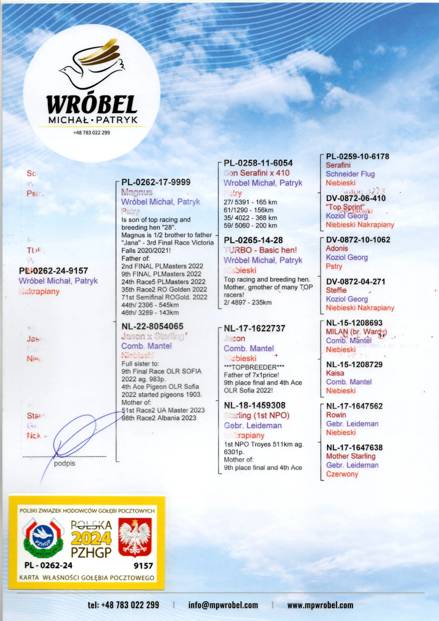 Oryg. gołąb z hodowli Mariusz Weksznejder więcej informacji w rodowodzie lub pod nr tel. +48 575-765-424