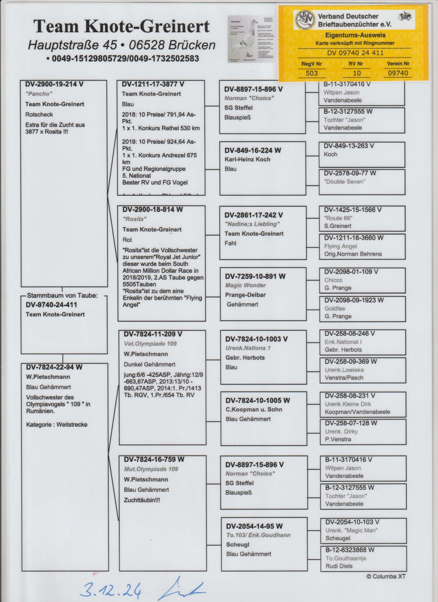 Oryg. gołąb z hodowli Team Knote Greinert więcej informacji w rodowodzie lub pod nr tel. 603 400 723