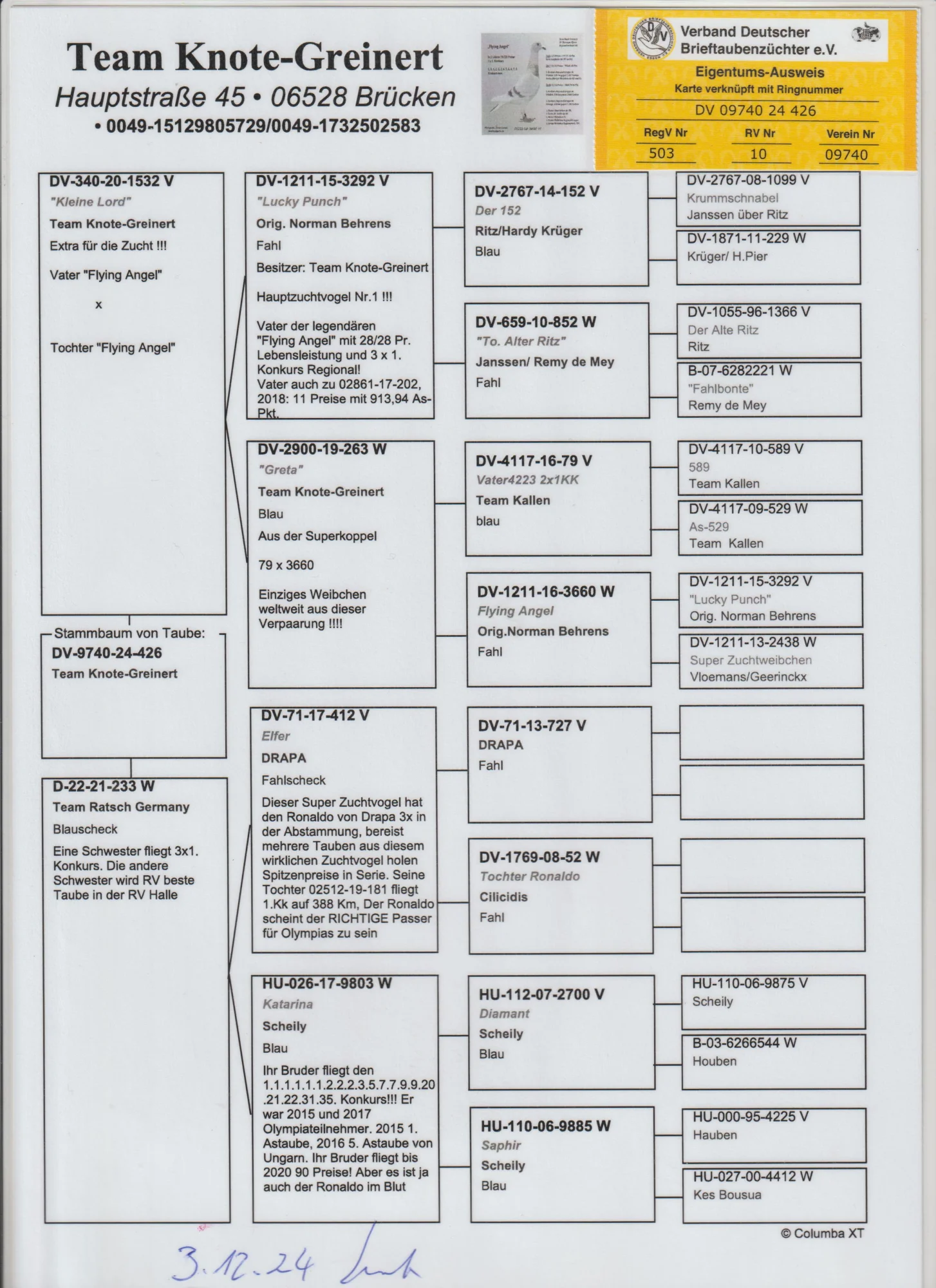 Oryg. gołąb z hodowli Team Knote Greinert więcej informacji w rodowodzie lub pod nr tel. 603 400 723