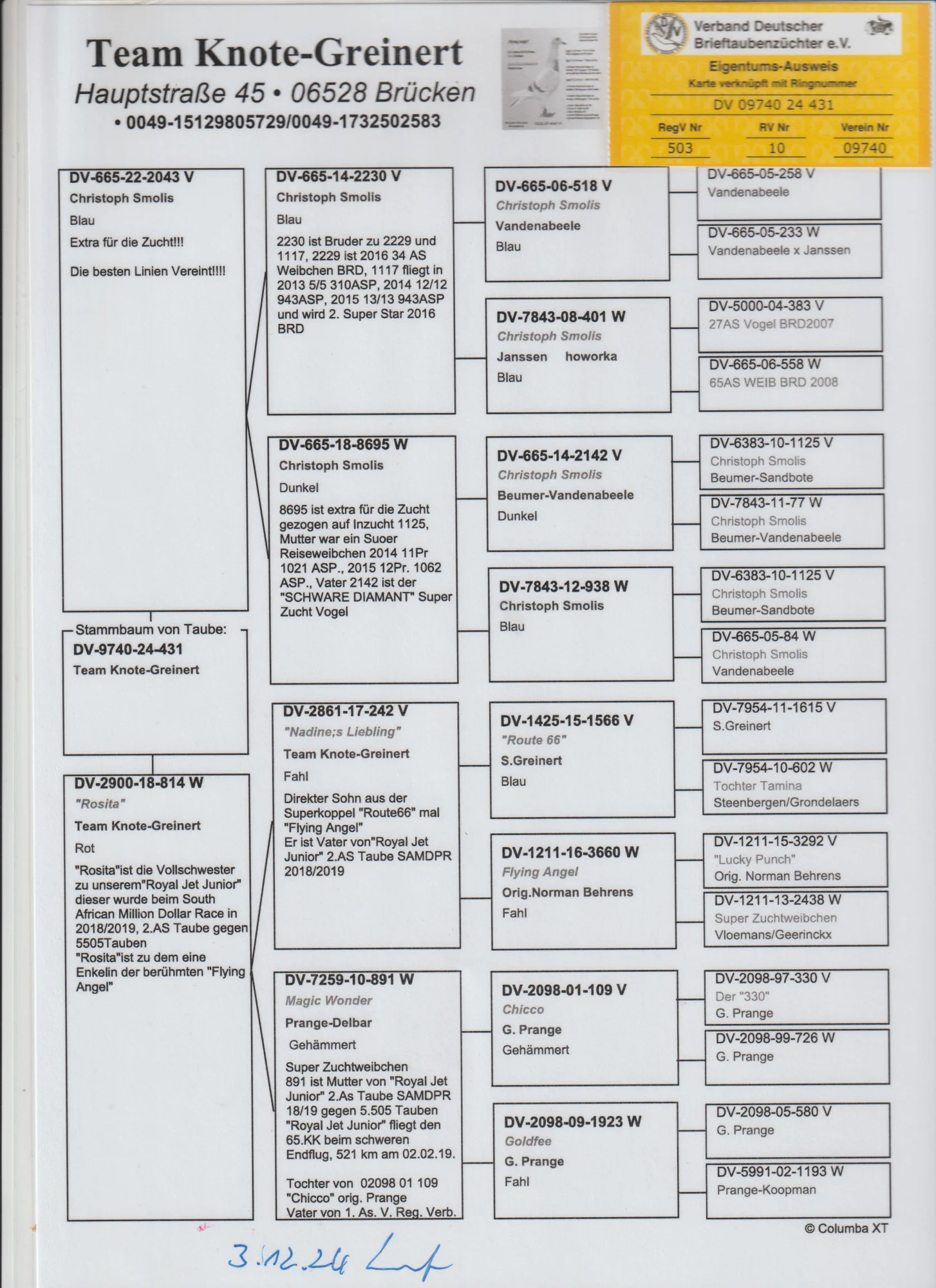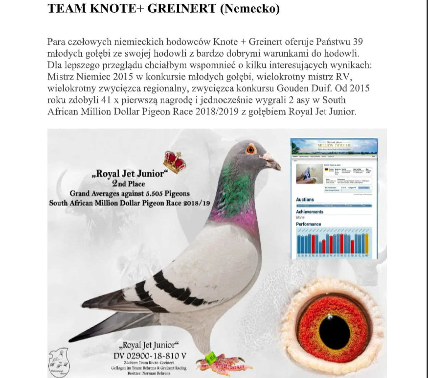 Oryg. gołąb z hodowli Team Knote Greinert więcej informacji w rodowodzie lub pod nr tel. 603 400 723