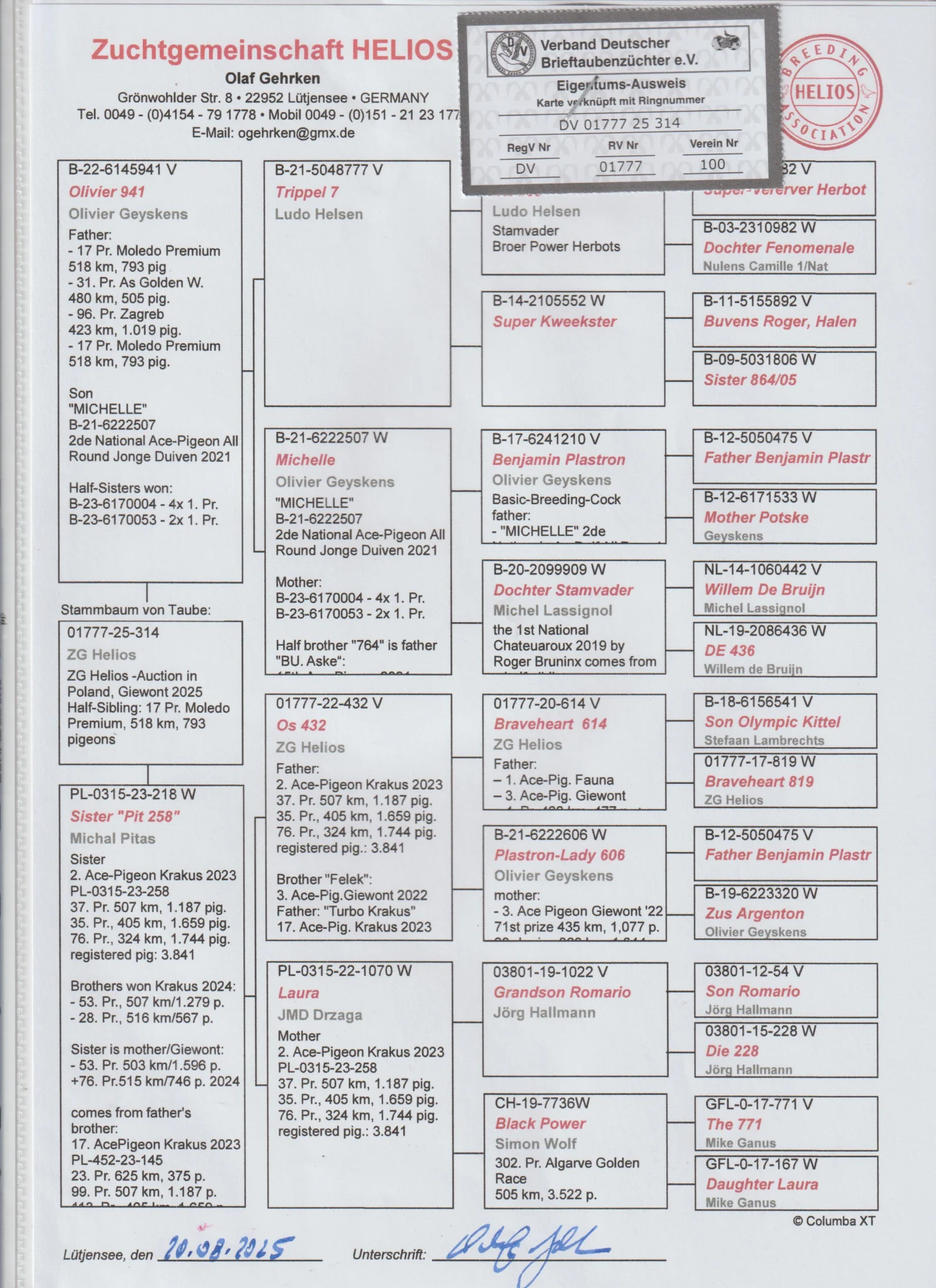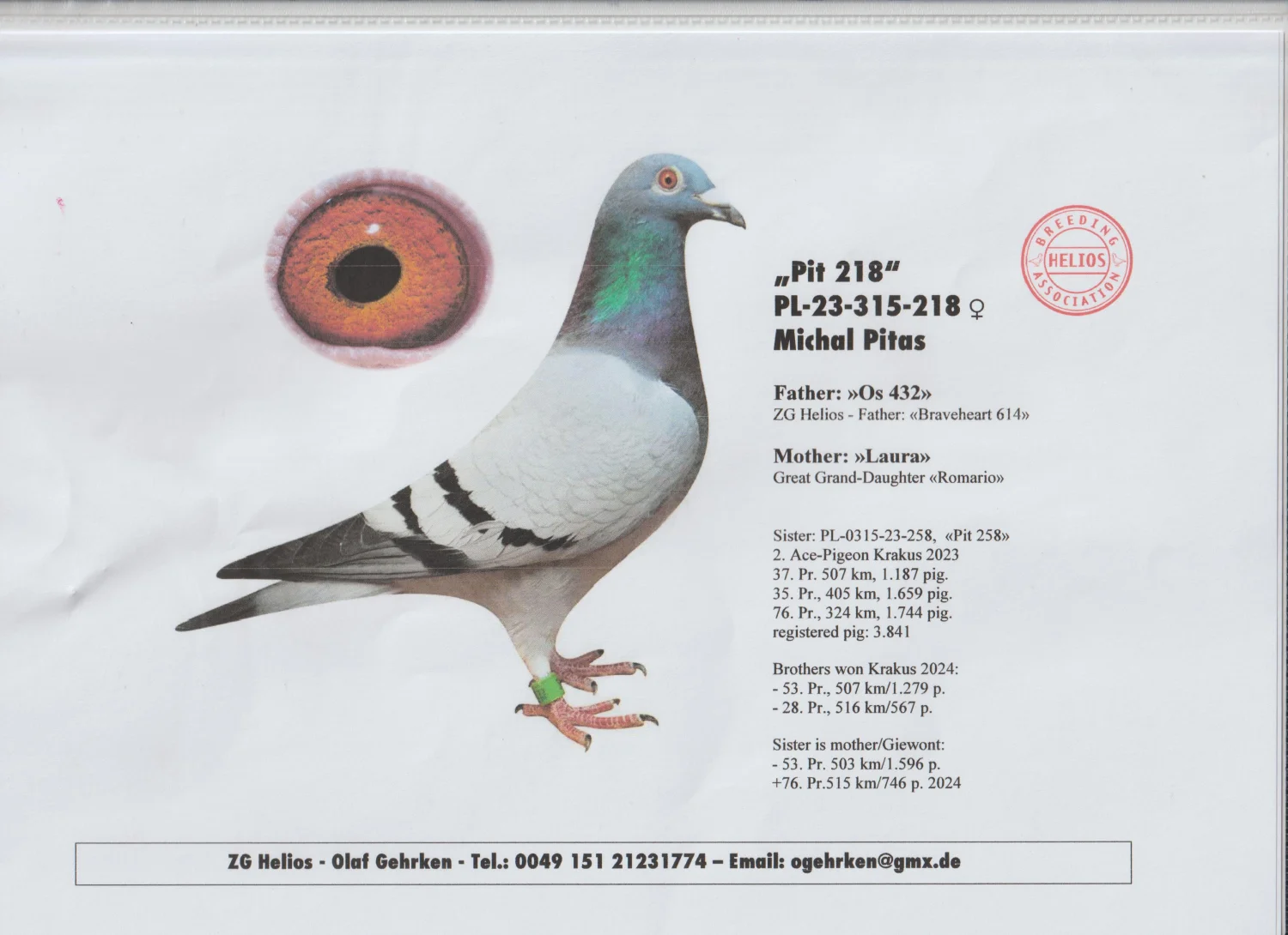 Oryg. gołąb z hodowli ZG Helios więcej informacji w rodowodzie lub pod nr tel 603 400 723